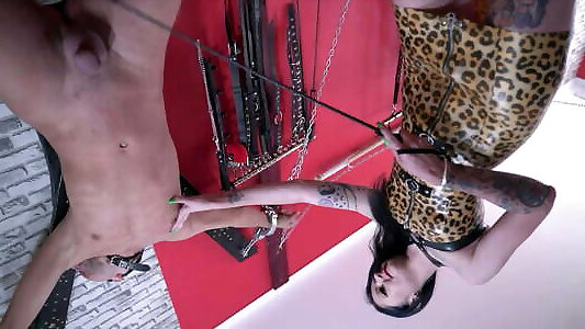 Severe ball whipping CBT - Pulling out his ball hair - Testicle whipping - Mistress Zeida and Italian Lady Scarlet