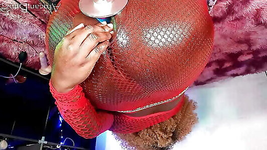 Black Dildo Fucking in Latex Outfit, Fishnet Stockings, and High Heels