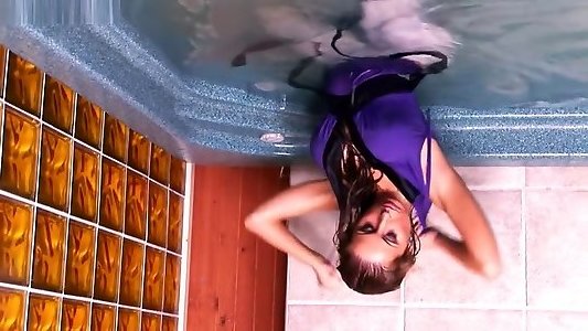 Sarah gets here purple half-shirt and taut milky pants get all moist.