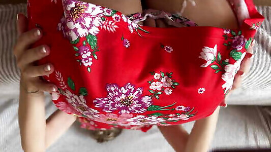 She lies on the bed in a dress without panties with legs spread wide