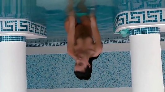 Thin dipping dark haired leaves the pool to have her Asian