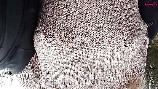 Boobwalk: Walking braless in a pink see through knitted sweater