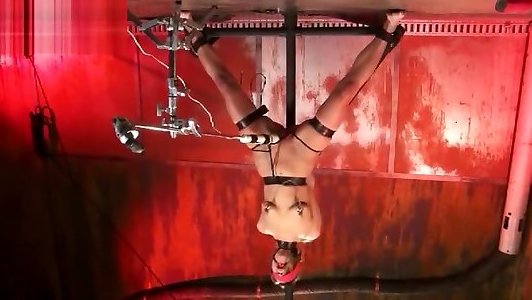 Nipples bound to toes, funnel gag directly below her puss.Made to burst like a explosion!