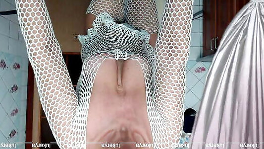 Cheery Lukerya flirts again in the kitchen in a mesh jumpsuit