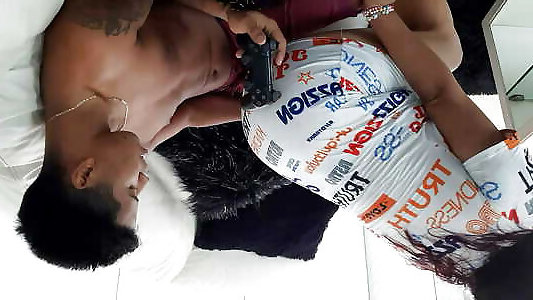 My super-naughty step-mother interrupts my game to inhale my knob.