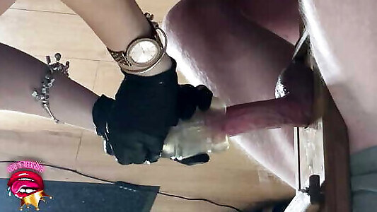 Close up - Femdom edges cock to ruined orgasm in a glass