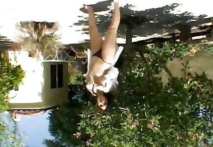 Dark-haired babe in stocking Tania Kiss riding a chisel outdoors