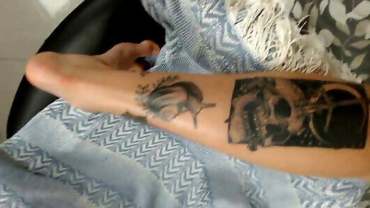 Inked nymph Effy caresses lotion on her uber-sexy tatted legs