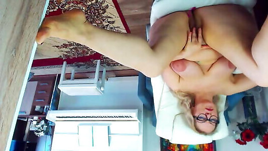 Light-haired mature with humungous cupcakes has climax on bed