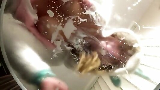 Pouring euro lezzies fingering holes on the Naked Body and Squeezing the Breasts in the Milk