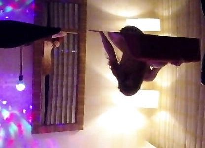 The dame does gymnastics in the bedroom and the grubby elder man watches her