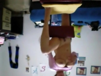 Pretty platinum-blonde nymph in pigtails twerks her yam-sized arse in front of the web cam