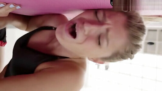 Chubby platinum-blonde teenage with pigtails is throat poked in multiracial porno flick