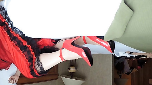 Sissy Ray in Red Teffeta sundress on bed