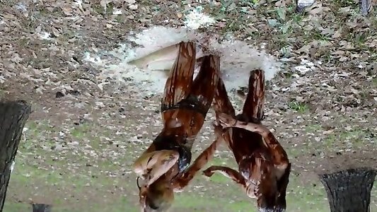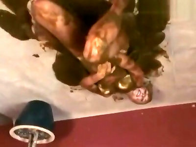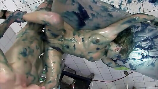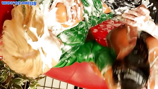 Two chicks wrestling in slime
