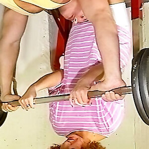 A huge-titted lesbo cougar twat eats then pounds brunette mate