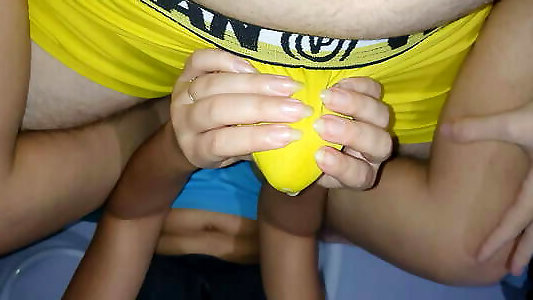 Hj through lingerie, cock-squeezing briefs, cum in trousers