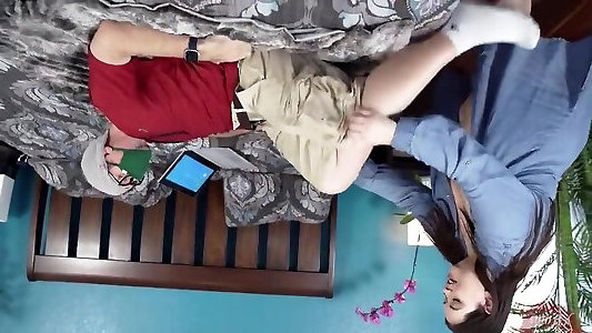 Sexy petite brunette maid gets fucked by the japanesse prostate guy in his office chair