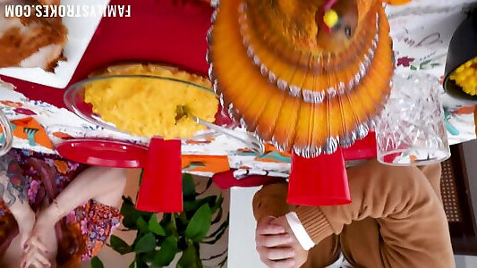 Crimson haired babe gives a oral under the table at Thanksgiving dinner