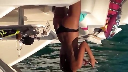 2 stunners with congenital titties de-robe out of their bikinis on bare-chested beach