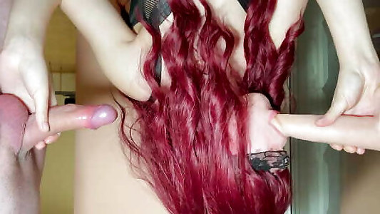 HORNY GIRL SUCKS TWO HUE COCKS TO A MOUTH CUMSHOT