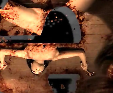 Fettered to a post she writhes around trying in vain to adjust herself in her awkward crouching position.