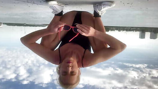 Cougar cool wonderful towheaded outdoors on river bank washes truck sans underpants and boulder-holder under dress. No undies in public