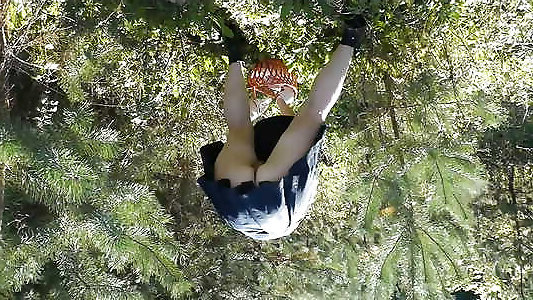 Cougar handsome blonde came to woods to pick mushrooms and left behind to wear underpants. No undies under skirt. Public nakedness