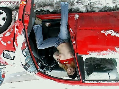 Nasty ginger-haired teenager gal solo milks in a car in winter