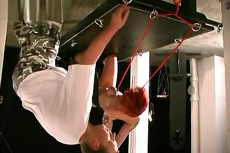 Nude Playgirl Stands With Her Gigantic Tits Corded Up In Straps