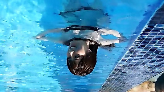 Charming Japanese gal Yumi Sugimoto spends her morning in the pool