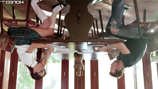 Nerdy schoolgirl with glasses takes hefty bone in huge booty on table Roxanne Rae