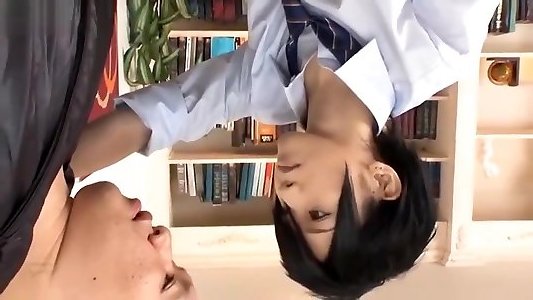 Asian sandy-haired in a skirt and blouse deepthroats his cock