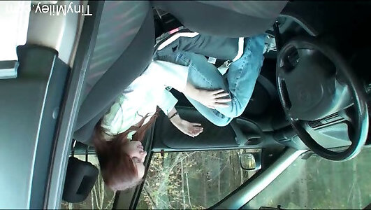 Ultra-kinky redhead white female in the car masturbating outdoors