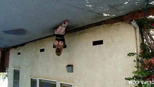 przywiązany do balustrady w rajstopy kabaretki i obcasy można zobaczyć moje piękne cycki i tyłek, podczas gdy mam usta i pussy fucked