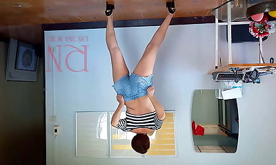 Regina Noir in denim shorts. Home striptease. Housewife flashes her snatch. The depraved stepmother undresses. boobs and