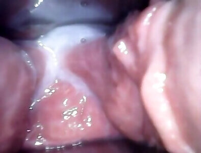 丈夫观察到他的妻子将一个大阴茎插入她收缩的阴道。